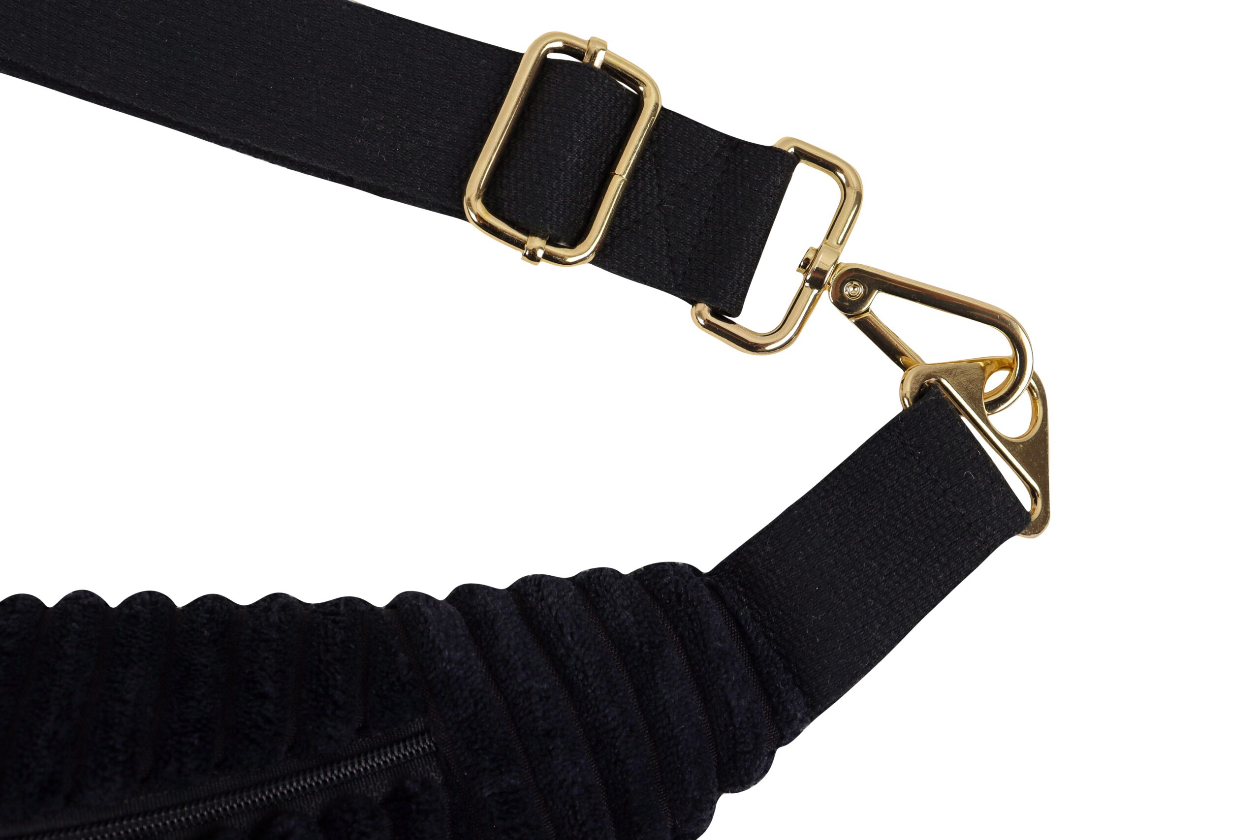 - Zamek: Zamek na czarnej taśmie zakończony złotym suwakiem, który zapewnia bezpieczeństwo i łatwy dostęp do zawartości.